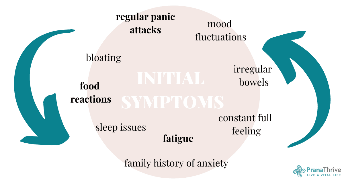 Presenting symptoms: Anxiety (since childhood, family history), sporadic panic attacks, sleep issues, bloating, feeling of fullness, irregular bowel movements, food reactions, afternoon fatigue