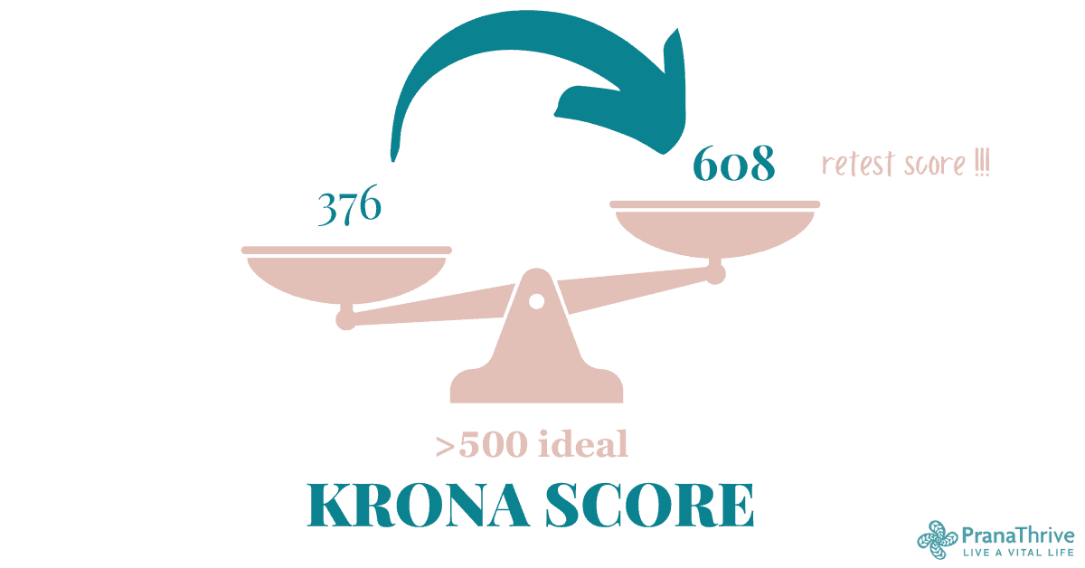 Microbiome diversity increased 232 points (Krona score 376 → 608)