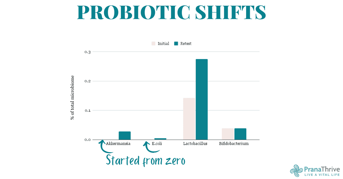 Akkermansia muciniphila: Dramatically increased. This keystone species maintains the gut lining's protective mucus layer — its restoration confirmed her leaky gut had repaired.