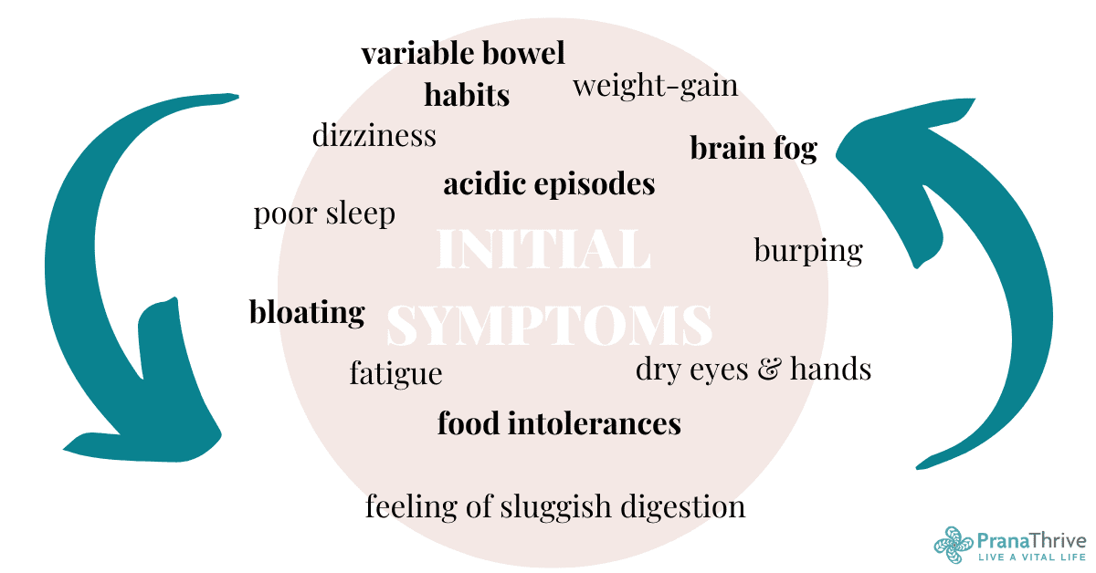 Presenting symptoms: Bloating, weight gain, acid reflux, fatigue, poor sleep, dizziness, food intolerances, feeling of incomplete digestion, variable bowel habits, brain fog, burping, dry eyes and hands