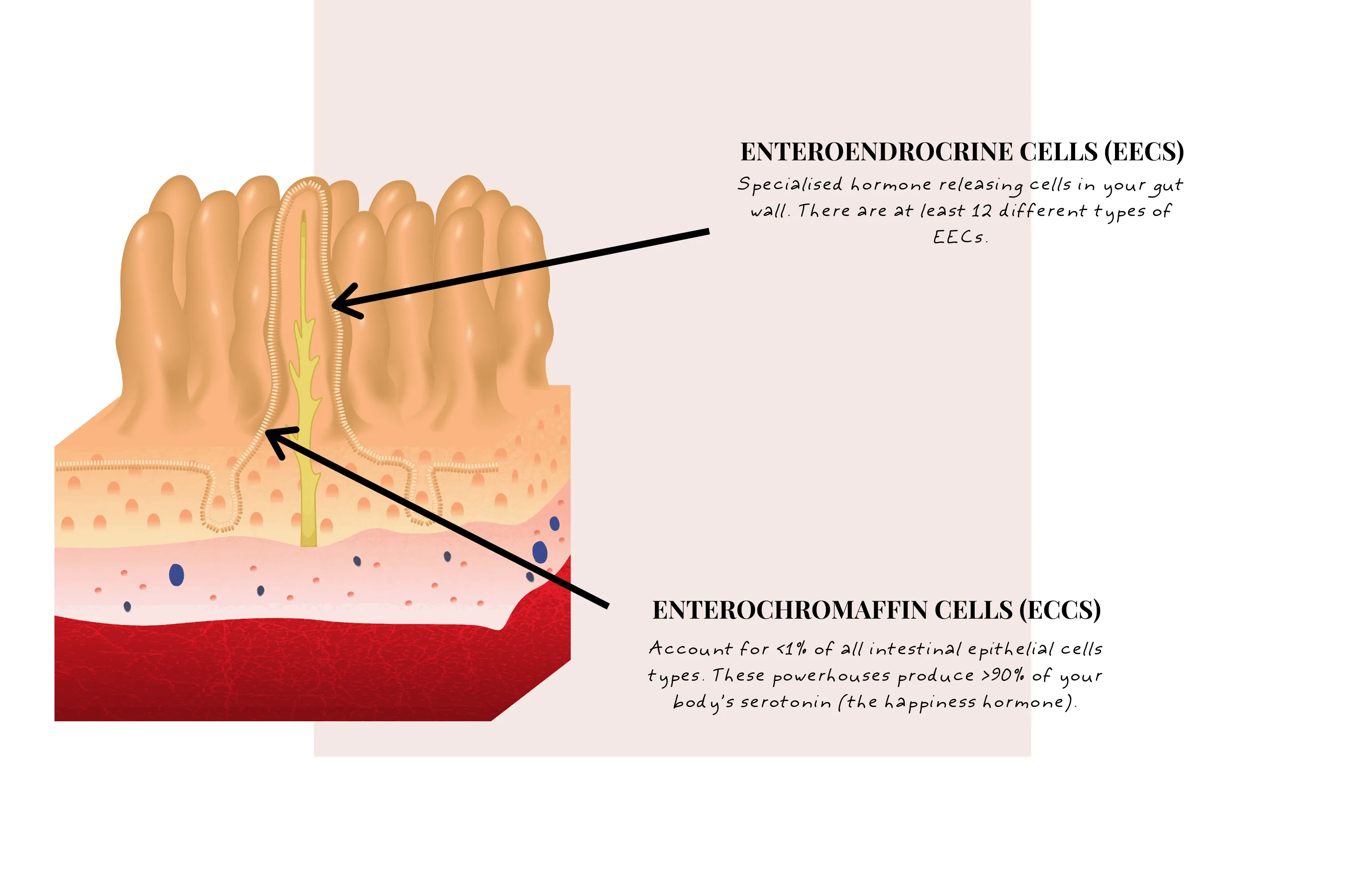 Account for <1% of all intestinal epithelial cell types. These powerhouses produce >90% of your body's serotonin (the happiness hormone). They're thought to affect intestinal motility, secretion, nausea, and hypersensitivity.