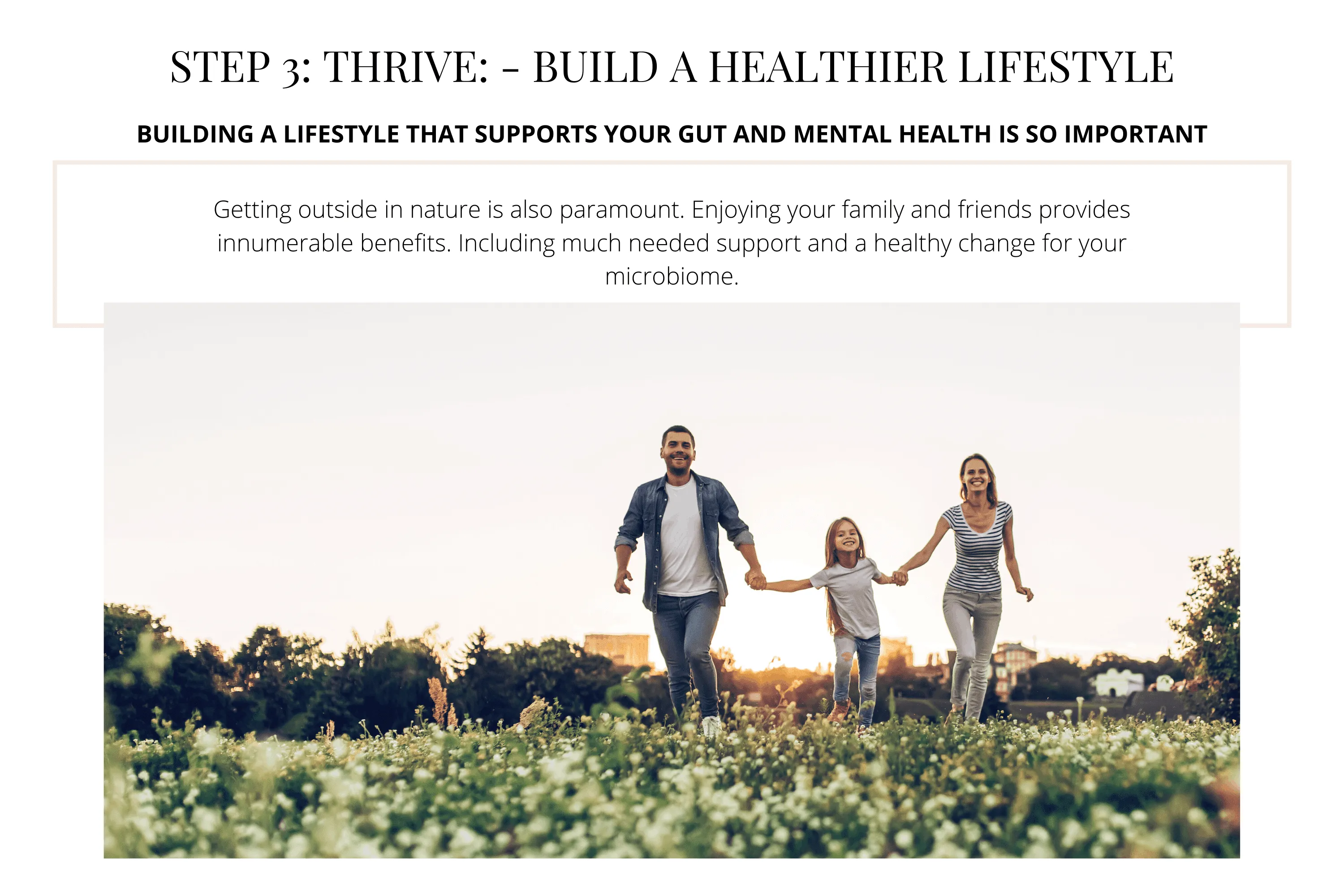 Getting outside in nature is also paramount. Enjoying your family and friends provides innumerable benefits, including much-needed support and a healthy change for your microbiome.