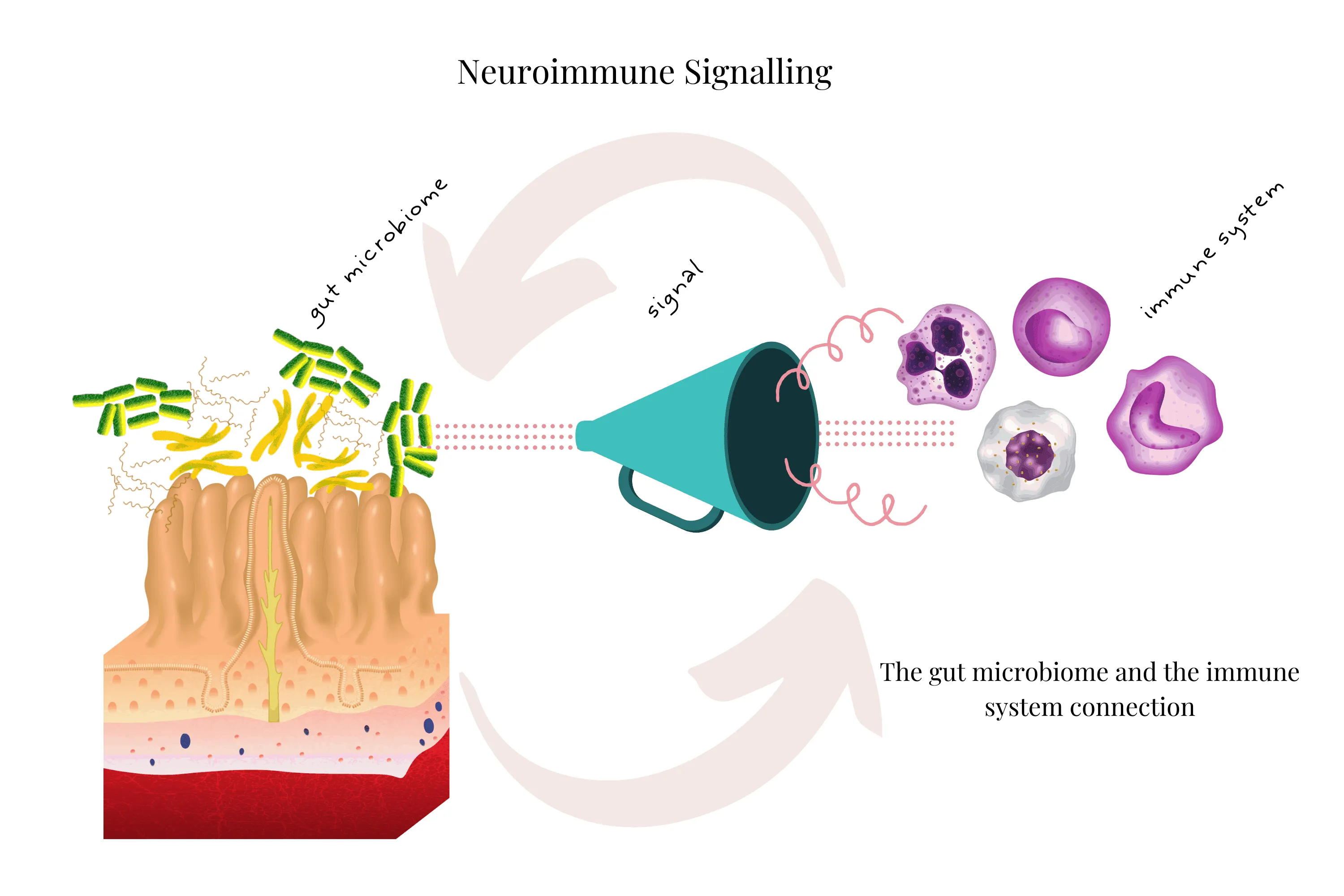 These molecules then stimulate signals via interactions with specialised cells in the mucosal epithelial lining: