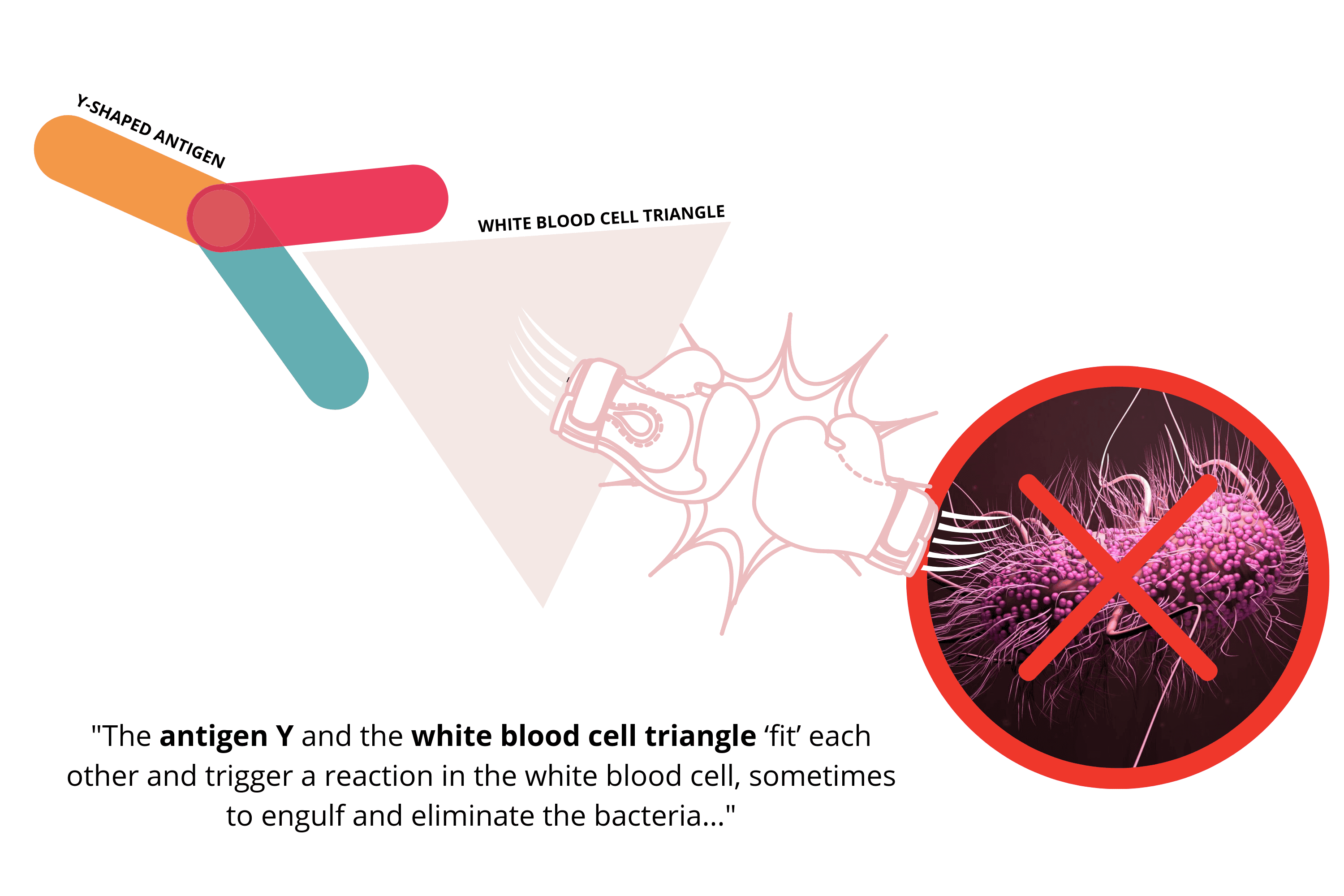 Now imagine these Y-shaped antigens coming across much bigger blob shaped white blood cells with little triangle shapes on the surface. The antigen Y and the white blood cell triangle 'fit' each other and trigger a reaction in the white blood cell, sometimes to engulf and eliminate the bacteria, other cells may produce antibodies encoded to remember this particular threat.