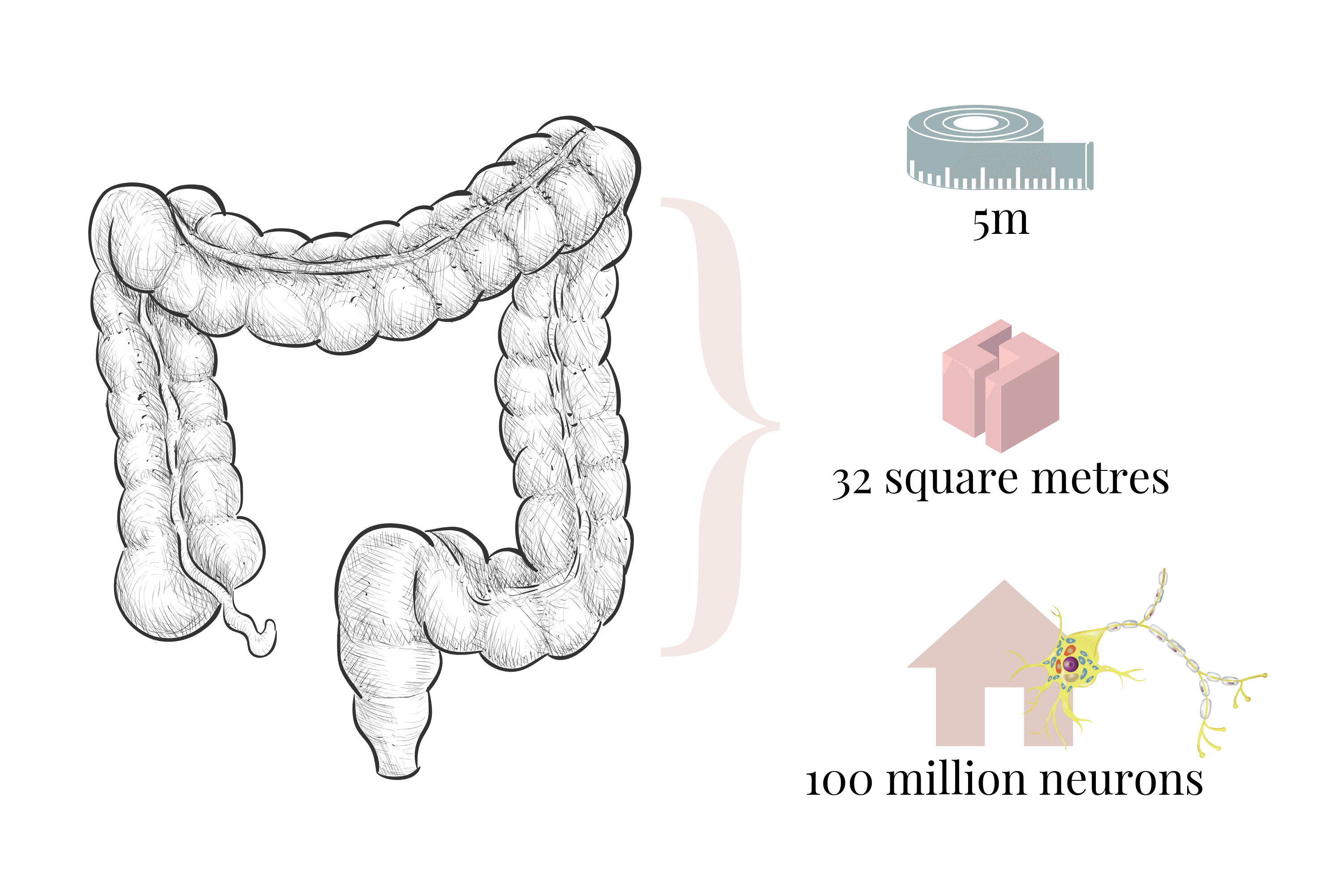 Your gastrointestinal tract, or gut, is roughly 5m in length, has an approximate surface area of 32 square metres and is home to an estimated 100 million neurons.