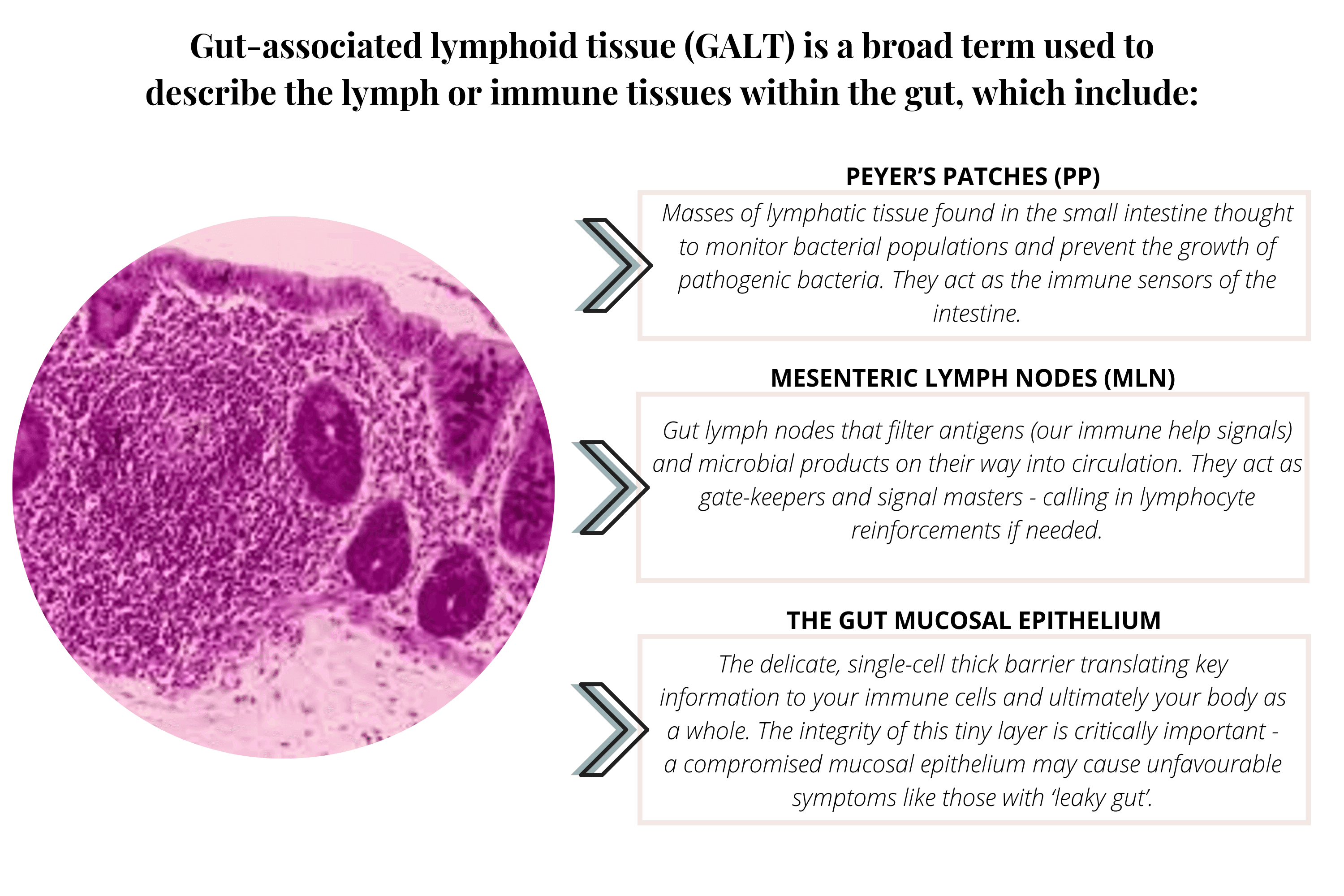 Gut-associated lymphoid tissue (GALT) is a broad term used to describe the lymph or immune tissues within the gut. These fundamentally important lymphatic tissues are interwoven with arteries, veins and nerve fibres creating a tight immune network all working with your greatest health in mind.