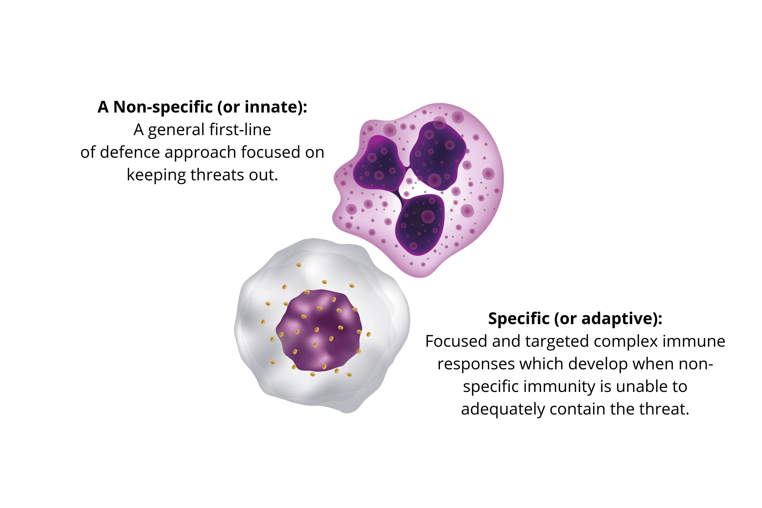 Specific (or adaptive) – Focused and targeted complex immune responses which develop when non-specific immunity is unable to adequately contain the threat.