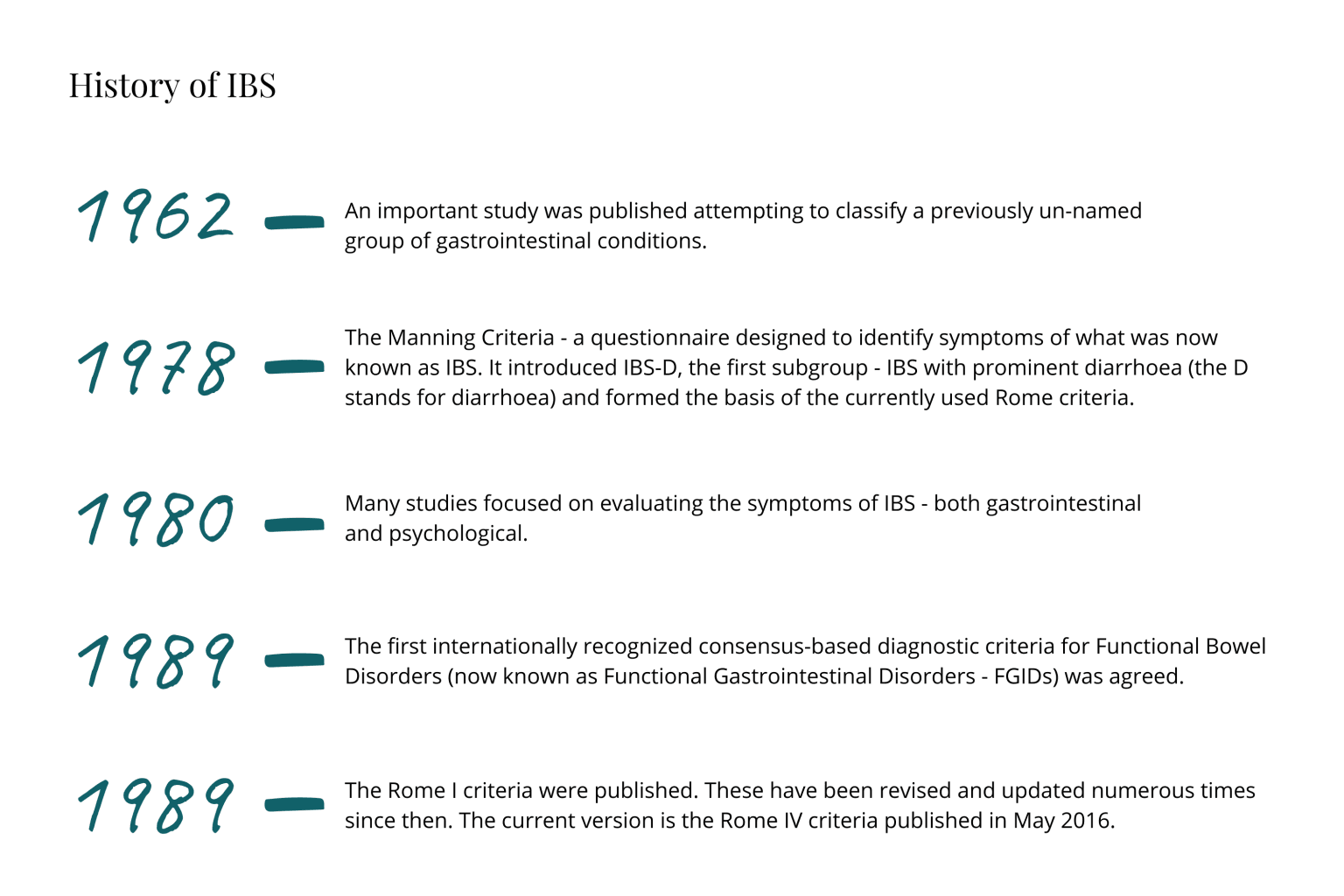 From here, well into the 1980's many studies focused on evaluating the symptoms of IBS – both gastrointestinal and psychological. In 1989, the first internationally recognised consensus based diagnostic criteria for Functional Bowel Disorders (now known as Functional Gastrointestinal Disorders – FGIDs) was agreed.
