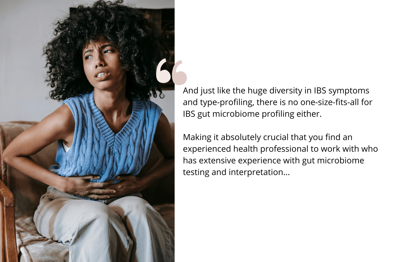 And just like the huge diversity in IBS symptoms and type-profiling, there is no one-size fits all for IBS gut microbiome profiling either. Making it absolutely crucial that you find an experienced health professional to work with who has extensive experience with gut microbiome testing and interpretation.