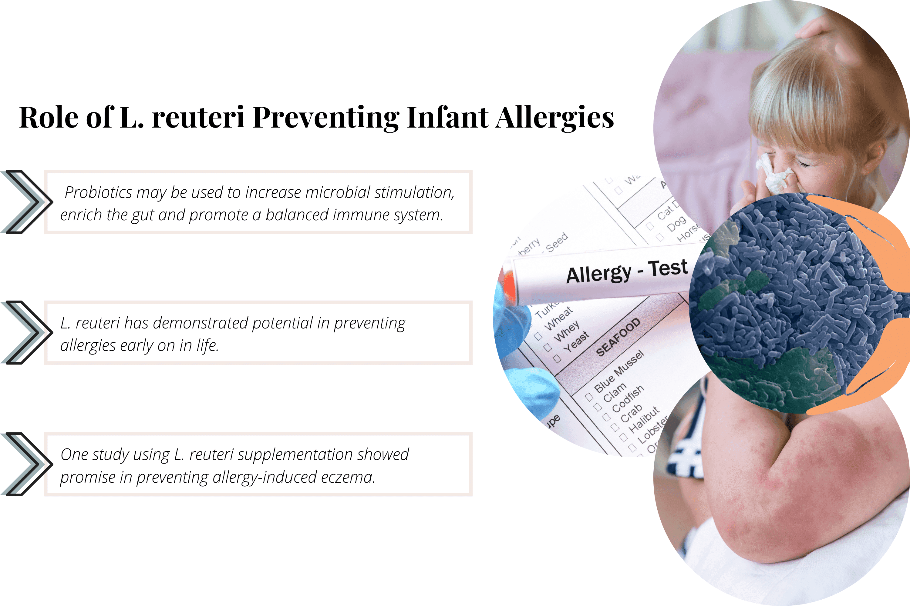 Well, the increasing prevalence of allergies in affluent countries may actually be caused by reduced microbial stimulation. Probiotics may be used to increase microbial stimulation, enrich the gut, and promote a balanced immune system. L. reuteri has demonstrated potential in preventing allergies early on in life.