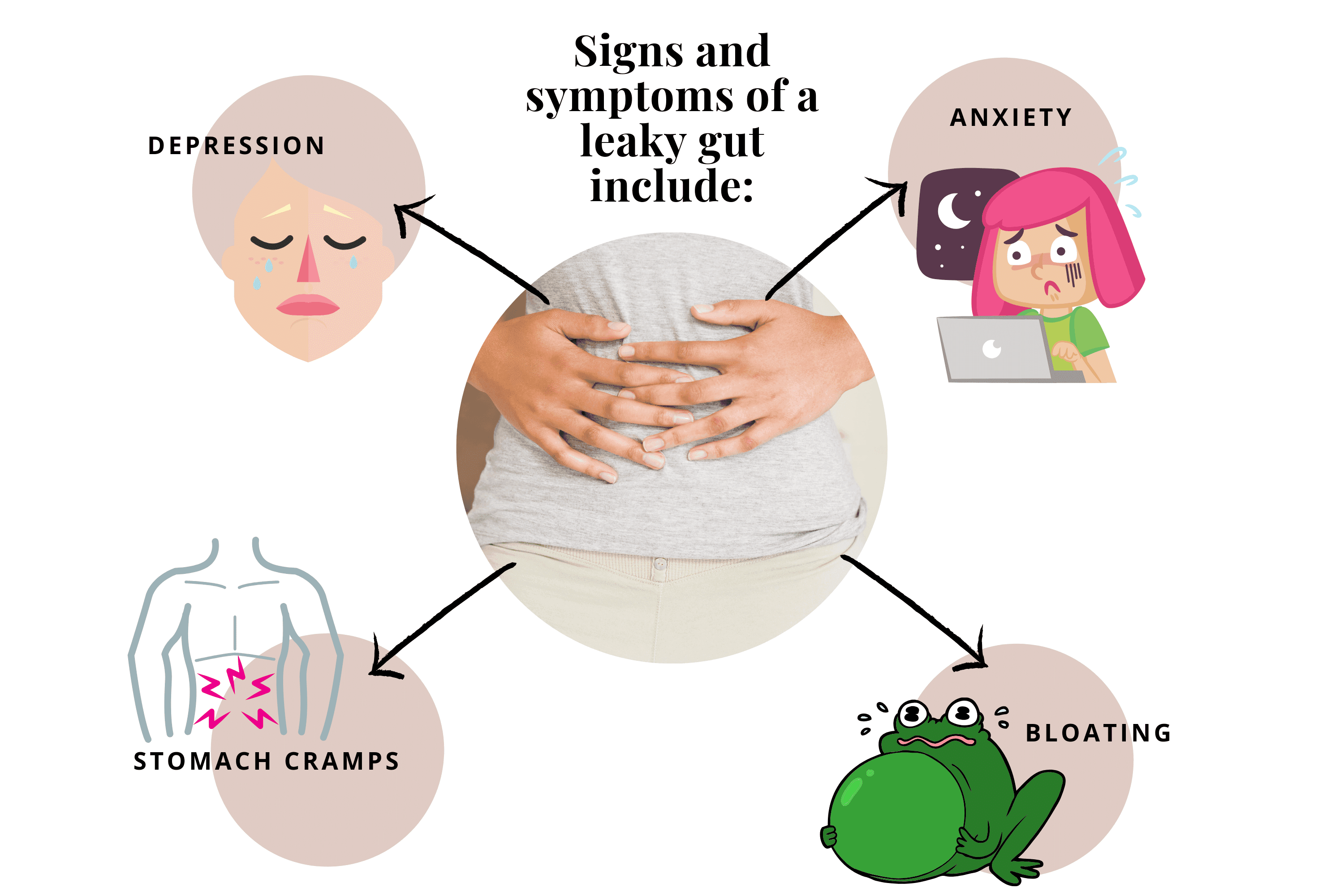 Signs and symptoms of leaky gut include depression, anxiety, stomach cramps, and bloating.