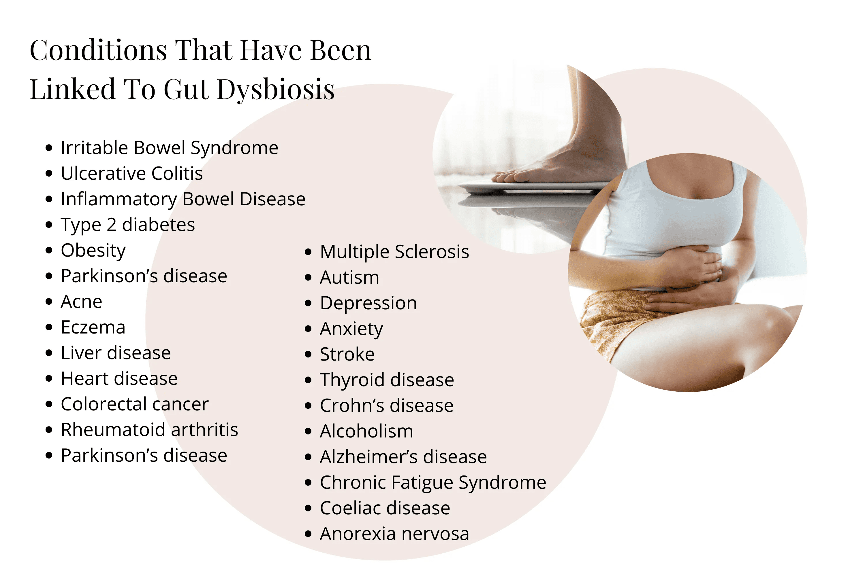 Gut dysbiosis is an imbalance in the bacterial community in your gut. It can result in a number of digestive and non-digestive signs and symptoms, including constipation, diarrhoea, anxiety, and depression. Additionally, gut dysbiosis is linked to a huge number of conditions, including Crohn's disease, type 2 diabetes, and colorectal cancer, to name a few.
